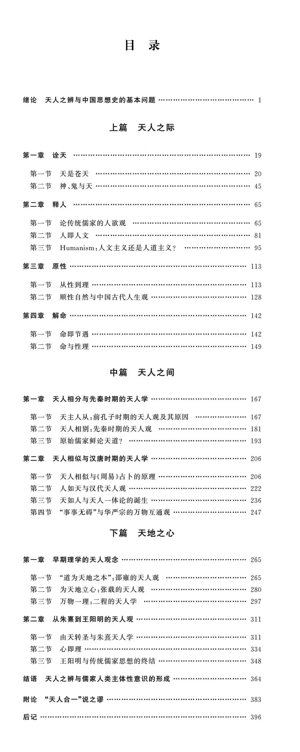 本书以天人关系的历史演变为主要线索,探讨以儒家为代表的中国古代天人关系观念的历史演变及其意义。本书认为,天人关系是中国传统思想史的基本主题,中国思想史便是天人关系观念史。天人关系观表面上看属于以苍天为代表的大自然与人类及其文化之间的关系,实则体现了人类对自身生存境遇的思考,当我们主张顺天由命时,常常表现为消极的人生观,反之,主张由己而立命时,它体现了人们的积极进取的生存观念。中国天人观,从早期的天主人从到理学家的人主天地,人,也由早期的听天由命转变为宇宙万物的主宰,从而最终决定了自身的生存。人的主体性地位因此而崛起。