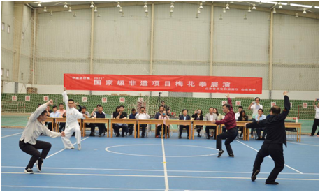 论坛期间穿插进行的“非遗进校园”活动,在山东大学和平击剑馆举行。在山东广播电视台文旅频道副总监赵秋唐的主持下,梅花拳太平车、一锛三枪、五虎锛、护身披、双提戟、落子枪过枪等表演节目次第上场,传统武术表演精彩纷呈。据悉,演武队伍主要由山东大学、山东师范大学等驻济高校的20余位在校生组成,山东大学金融研究院副院长石玉峰、菏泽市定陶梅花拳协会会长曹广超等应邀参与。