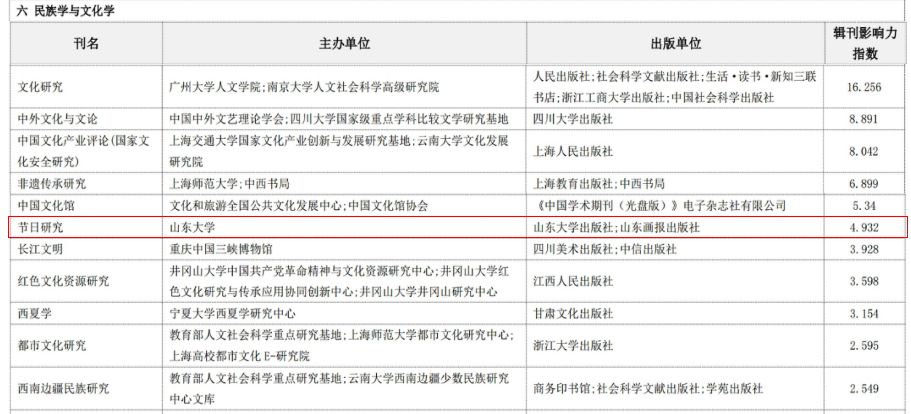 近日,中国科学文献计量评价研究中心发布了《高影响力学术辑刊评价报告(2025)》。报告按学科对参评的691种辑刊进行了影响力指数计算和排序,在定量基础上结合定性评价,遴选各学科排名前25%(Q1区)的191种辑刊为2025年度“高影响力学术辑刊”。山东大学主办的《节日研究》入选民族学与文化学学科高影响力学术辑刊,影响力指数为4.932,排名上升至第6位。