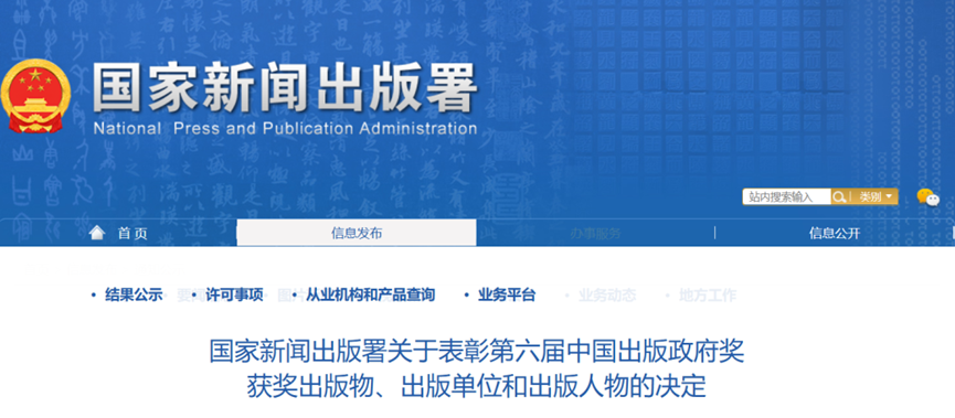 中国出版政府奖由国家新闻出版署主办,是我国新闻出版领域的最高奖,也是该领域唯一由政府而非行业评审的全国性重大奖项。该奖项每三年评选一次,主要表彰国内优秀出版物及在出版行业做出突出成绩的先进单位和优秀个人。