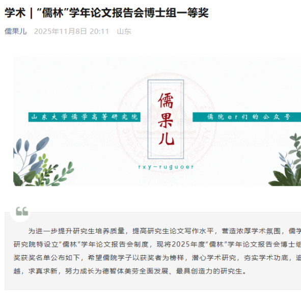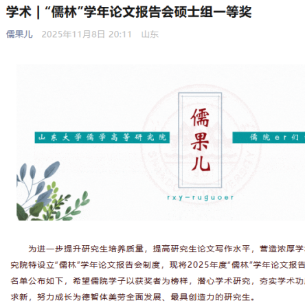 在学术育人方面,学院坚守“学术筑基 文化浸润”的育人理念,构建学术成长支持体系,引导青年学子将服务国家文化战略的使命自觉转化为潜心钻研的实际行动。学院扎实推进尼山学堂论文答辩会、研究生“儒林”报告会等品牌活动,推动203篇优秀论文展示;搭建科研桥梁,设立30项研究生课题,百余名儒院学子参与“《永乐大典》存卷综合整理研究”“全球汉籍合璧工程”等国家级重大科研项目;本研拔尖创新人才培养双重发力,尼山学堂“打破学科壁垒,注重元典导读”培养模式获评山东省高等教育本科教学成果奖特等奖,并获《中国教育报》专题报道,“中国古典学术人才培养模式创新与改革”获评山东省高等教育研究生教学成果奖一等奖;2025年儒院学子学术成果丰硕,本科生发表论文33篇,研究生发表433篇,其中A&HCI一区期刊3篇,CSSCI权威期刊2篇、重要期刊2篇,CSSCI期刊17篇,1篇《新华文摘》论点摘编;多名学子斩获校长奖学金、国家奖学金等荣誉,学术育人成效凸显。