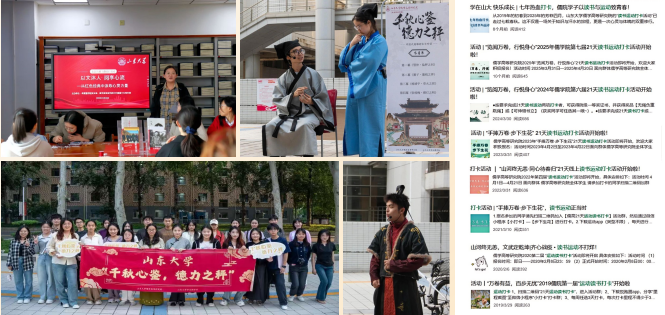 学院始终将思想政治引领作为首要任务,系统推进党团组织在思想筑基、人才培育、社会实践服务等环节的深度融合,持续提升党建带团建组织效能。面向全体团员开展党的二十届四中全会精神专题学习和习近平总书记给《文史哲》编辑部全体编辑人员重要回信精神学习,创新打造“院长讲思政”“书记讲党课”“两会归来大家谈”等特色思政品牌。联动多校多院开展党团联建行动,探索常态化协作机制。立足学院特色,做优思政品牌,推进五育融合,以传统文化丰富育人形式,连续四年举办“典籍故事青年说”,连续八年举办“览阅万卷·行悦身心”读书运动打卡活动,与蒋震图书馆党团支部联合举办“以文沐人·阅享心流”主题活动,举办“千秋心鉴,德力之秤”国学游园会,让思政教育融入日常,厚植青年理想信念,引领青年健康成长。