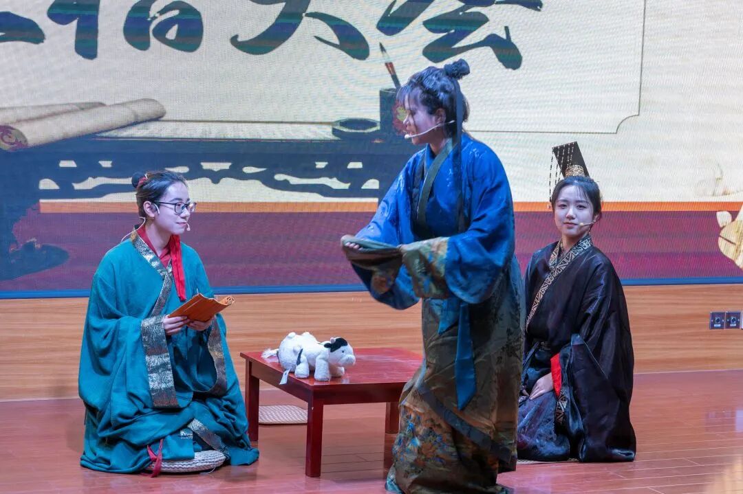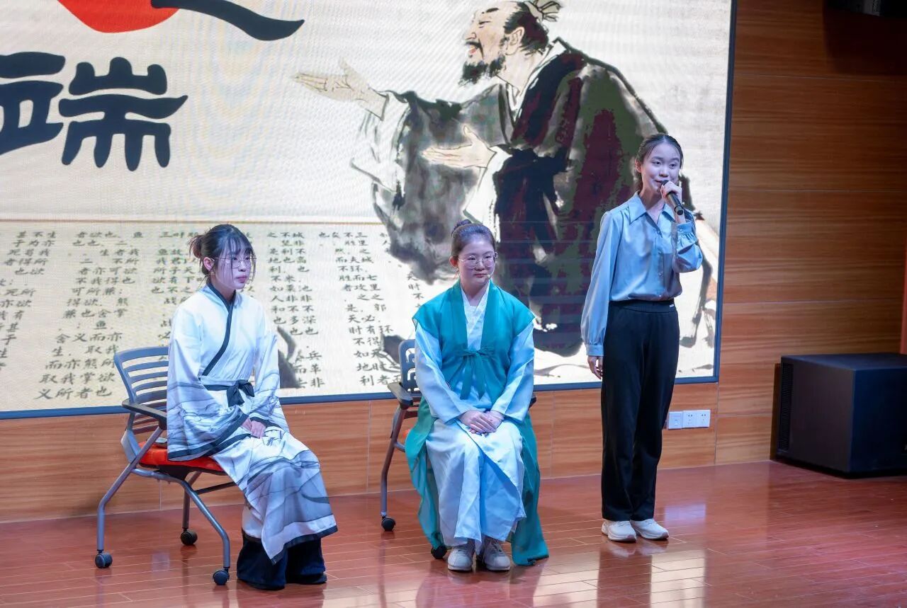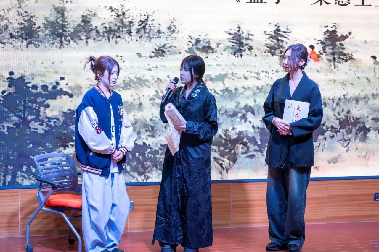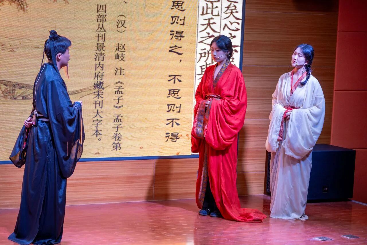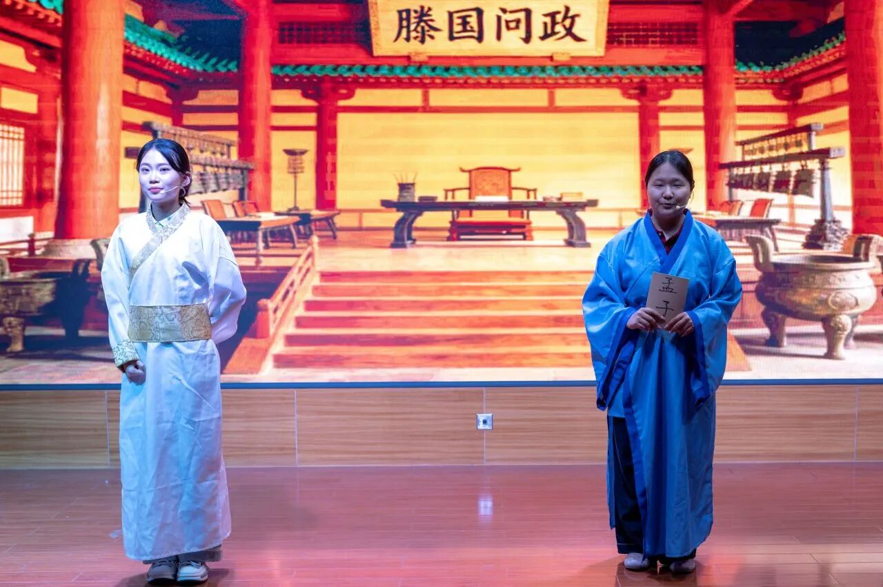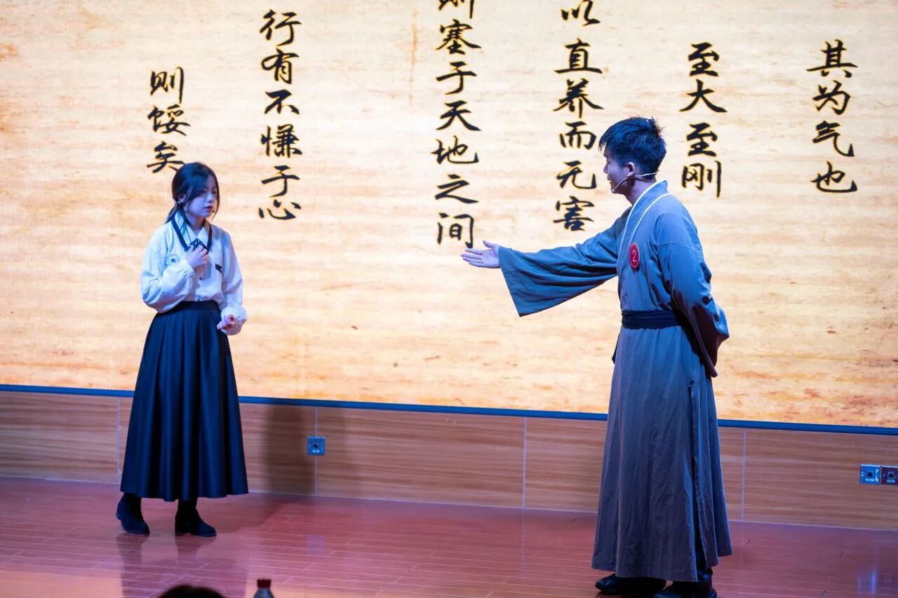 决赛现场气氛热烈,青年选手们各展所长,通过情景短剧、相声演绎、摇滚吟唱、跨时空对话等多样化形式,为观众带来精彩纷呈的《孟子》文化盛宴。整场展演立足经典章句,生动展现了“民贵君轻”的民本思想、“浩然之气”的人格追求与“舍生取义”的价值坚守。节目将孟学智慧与校园生活、青年成长、航天梦想、乡村振兴、绿色环保等时代主题有机融合,以青春话语诠释典籍内涵,充分彰显了当代青年学子坚定的文化自信与昂扬向上的精神风貌。
