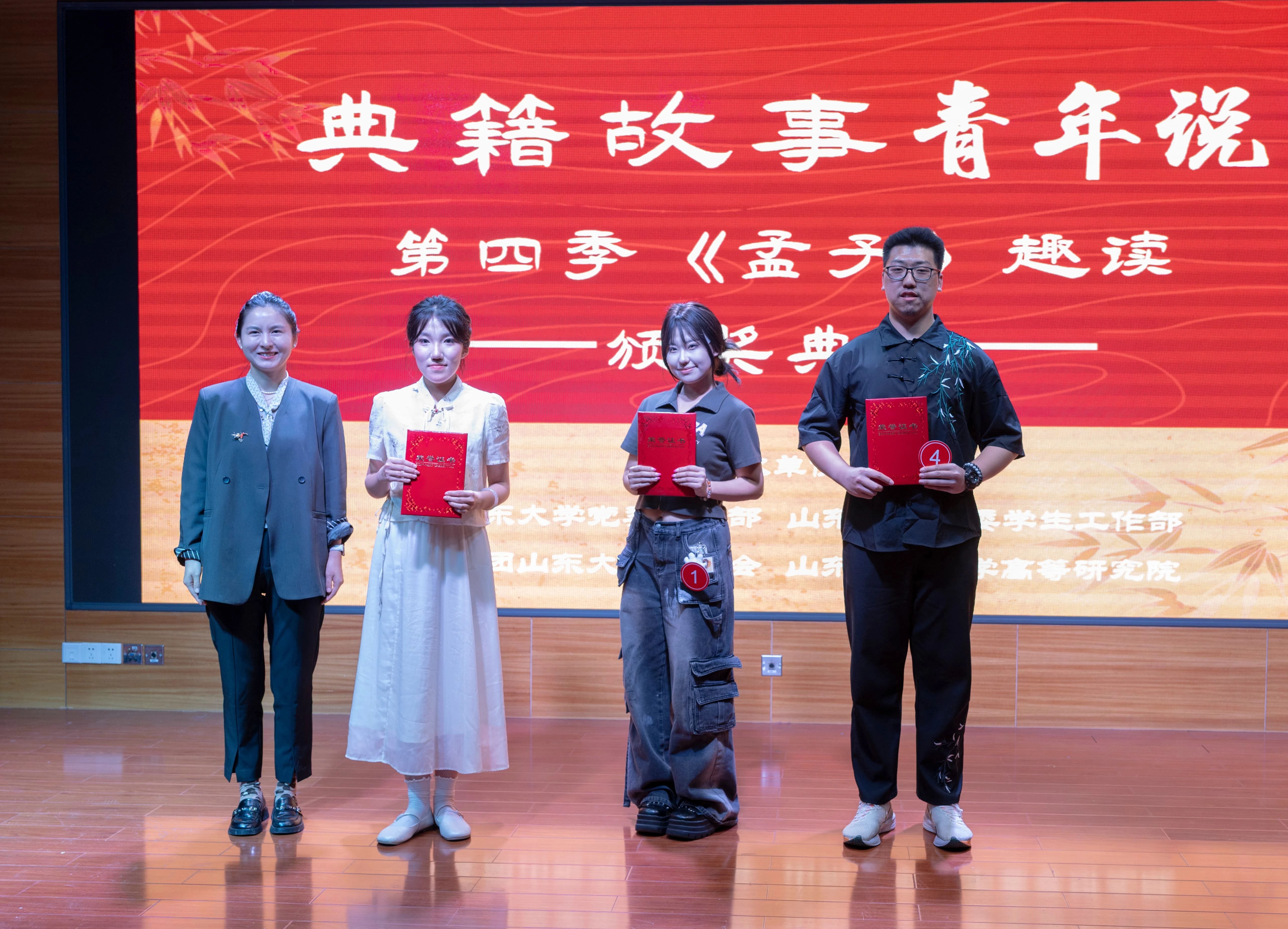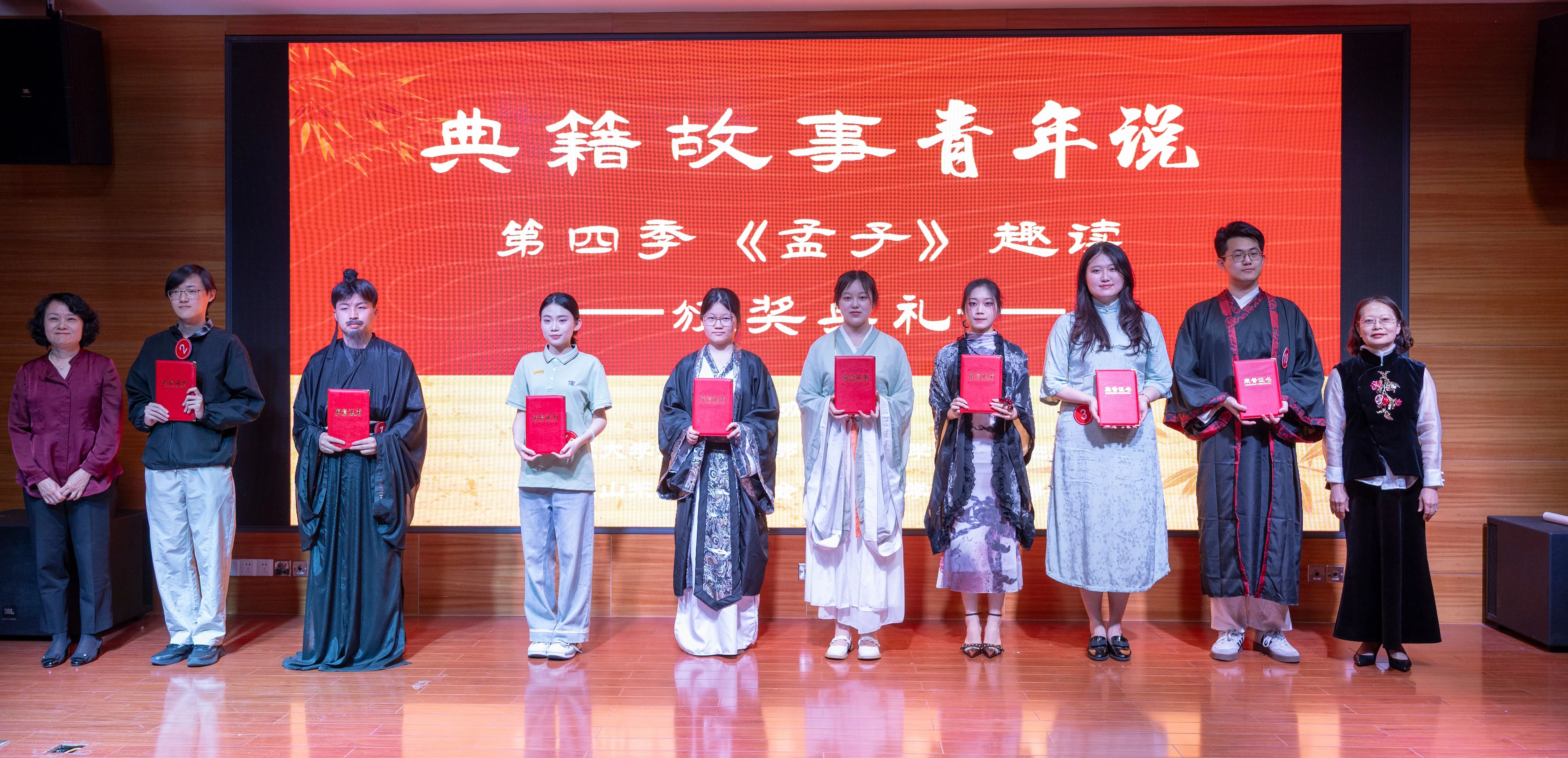 比赛最后,特邀嘉宾、专家评委为获奖选手依次颁奖并合影留念,山东大学“典籍故事青年说”第四季《孟子》趣读活动圆满落幕。