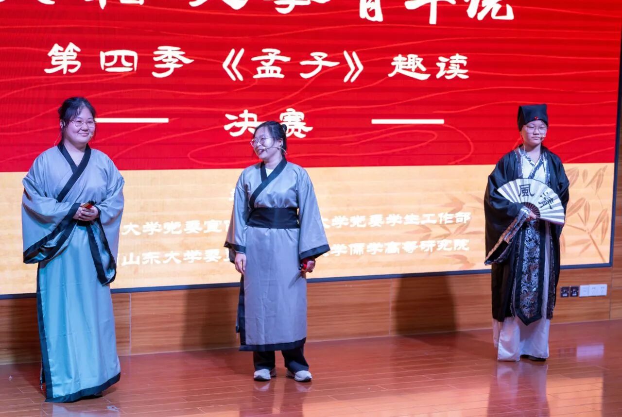 春光作伴,经典同行;文脉赓续,青年发声。《孟子》是儒家经典的重要篇章,蕴含深厚的价值追求、民本情怀、人格力量,其中“吾善养吾浩然之气”一句,不仅塑造了中华民族的精神气质,更与山东大学“学无止境,气有浩然”的校训精神深度契合。“典籍故事青年说”第四季《孟子》趣读活动自2026年1月启动,得到全校师生的大力支持。经专家评审,共18组选手脱颖而出,晋级决赛。决赛舞台上,选手们倾情投入,将《孟子》中的经典篇章转化为鲜活的故事演绎,让儒家经典在青年手中“活”起来、“传”下去。